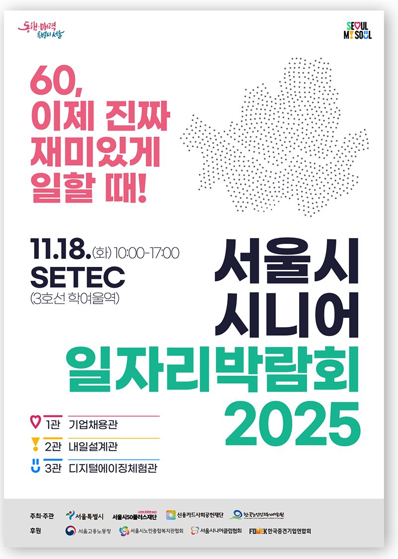 서울시는 오는 11월 18일(화) SETEC(강남구)에서 「서울시 시니어 일자리박람회 2025」를 개최합니다. 초고령사회 대응 종합대책‘9988 서울 프로젝트’의 하나로 마련된 이번 박람회에서는 시니어들이 쌓아온 경력과 전문성을 살려 경제적 자립을 이루고 사회참여를확대할 수 있도록 다양한 프로그램이 진행됩니다.