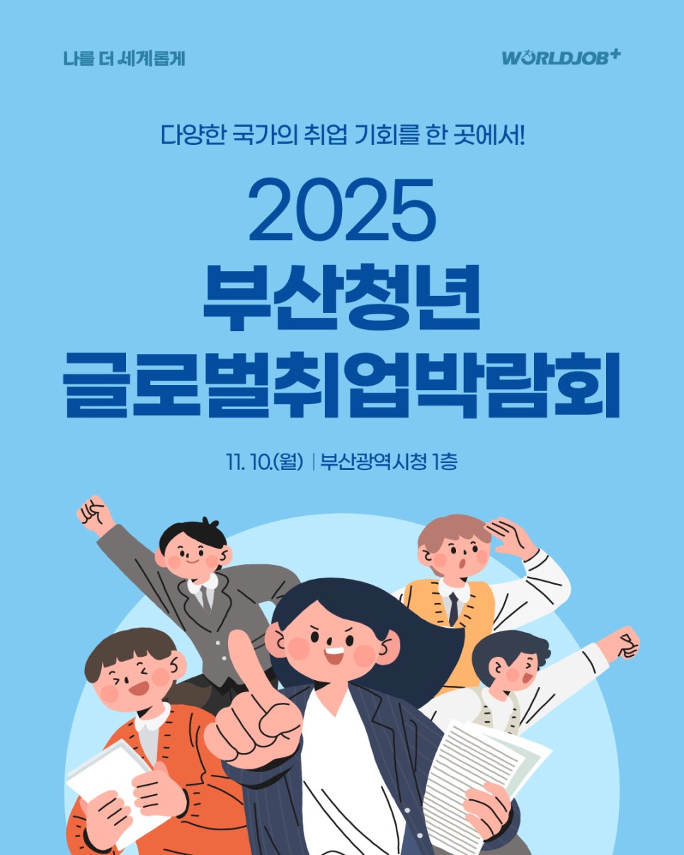 청년 여러분의 글로벌 도전을 응원하며, 2025 부산청년 글로벌취업박람회가 여러분의 해외취업 여정에 든든한 출발점이 되기를 바랍니다.많은 관심과 적극적인 참여 부탁드립니다.