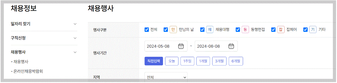 3. 채용행사에서 행사구분및 행사기간, 지역 입력하고 검색합니다.