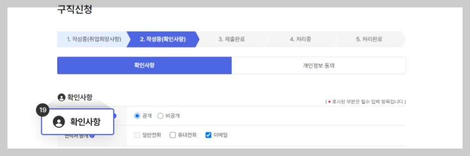 13.구직신청 공개여부, 연락처 공개여부, 취업알선 희망시기, 구직신청 목적 등을 선택하는 영역