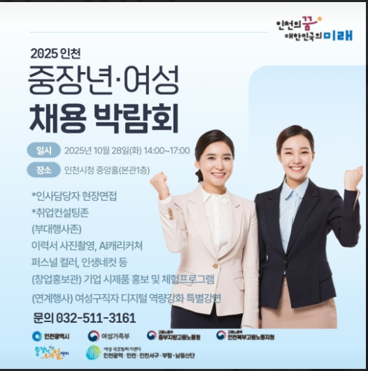 본 행사는 인천광역시, 여성가족부, 고용노동부, 노사발전재단 인천중장년내일센터, 여성새로일하기센터가 공동 주최하며, 문의는 032-511-3161로 가능합니다. 현장면접부터 취업컨설팅, 퍼스널컬러 진단, AI캐리커처 체험까지 단 하루 동안 취업과 자기계발을 동시에 경험할 수 있는 특별한 기회입니다.취업을 준비 중이시라면 지금 바로 참여하세요!당신의 새로운 커리어를 시작할 수 있는 자리가 바로 여기 있습니다.